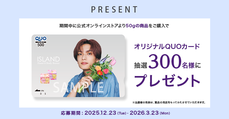 ISLAND公式オンラインストアのキャンペーン対象商品ページにて、「ハンド&ボディバター ベルガモット50g & ローズ50gセット亅、「ハンド&ボディバター ベルガモット50g亅、「ハンド&ボディバター ローズ50g亅をご購入いただいた方の中から抽選で300名様に、「オリジナルQUOカード」をプレゼントいたします。